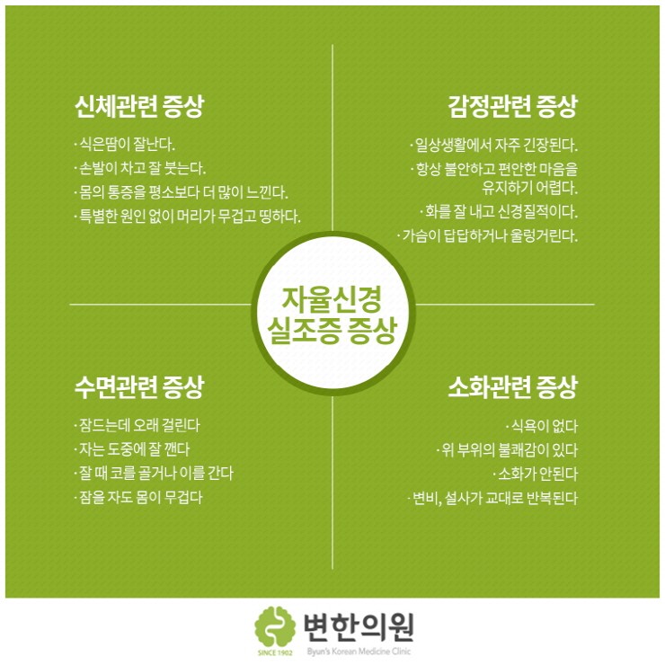 위와 같이 자율신경계이상이 발생하게 되면 내분비계와 더불어 자율신경계의 역할인 심혈관, 호흡, 소화, 비뇨기 및 생식기관 등에 다양한 증상들이 동시에 다발적, 그리고 복합적으로 올 수가 있어요