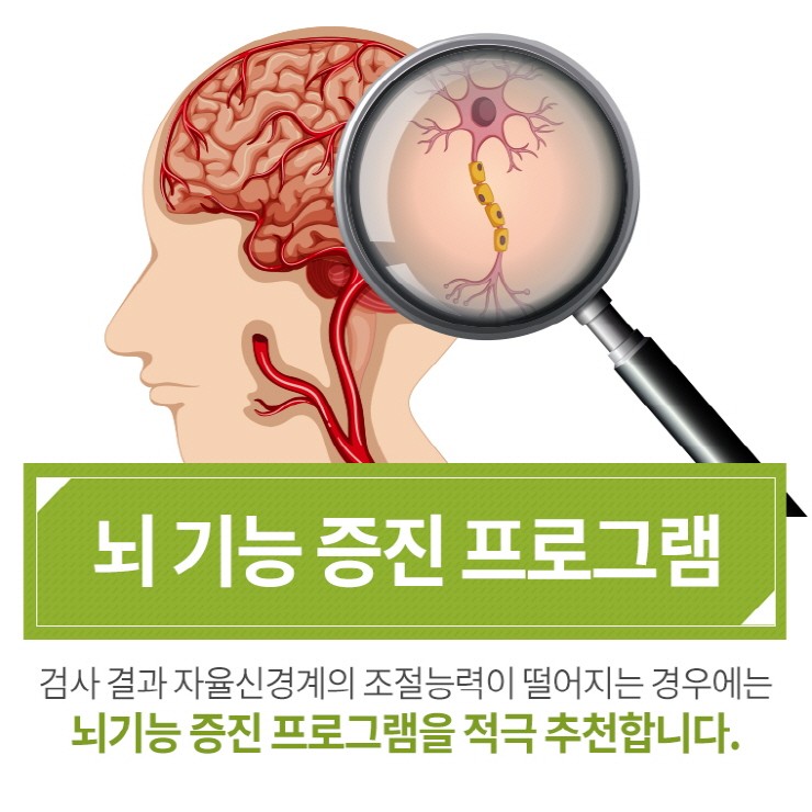 갱년기장애 뇌기능 증진 프로그램인 뇌재활치료도 진행하여 낮아진 쪽의 기능을 올려 자율신경계의 조절능력을 회복시켜드리고 있습니다!