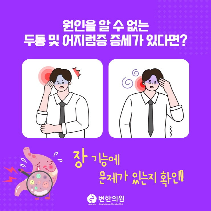 따라서 변한의원은 특별한 원인이 없는 두통 및 어지러움, 이석증에 의하여 고통 받는 분들께 장을 의심해보시라고 알려드린답니다