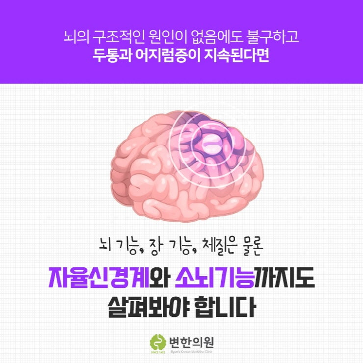 뇌의 구조적인 원인이 없더라도 두통과 어지럼증이 지속될 경우, 뇌 기능, 장 기능, 체질은 물론 자율신경계와 소뇌기능까지도 살펴봐야 한답니다