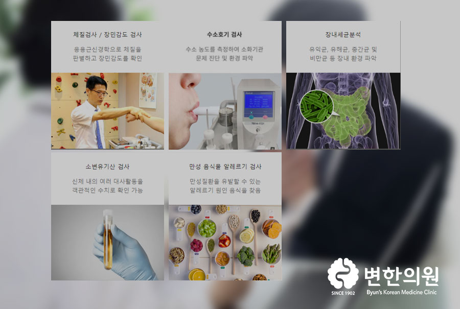 검사는 보통 체질검사, 장민감도 검사, 수소호기검사, GMA검사, 지연성 알레르기 검사, 자율기능 검사 등을 활용하는데 해당 검사들로 장내 환경, 영양 결핍 상태, 신경내분비활성 상태, 자율신경 균형 상태, 만성 알레르기 음식 등을 알아내어 자율신경실조증의 발생 원인을 정확히 알아낼 수 있습니다.