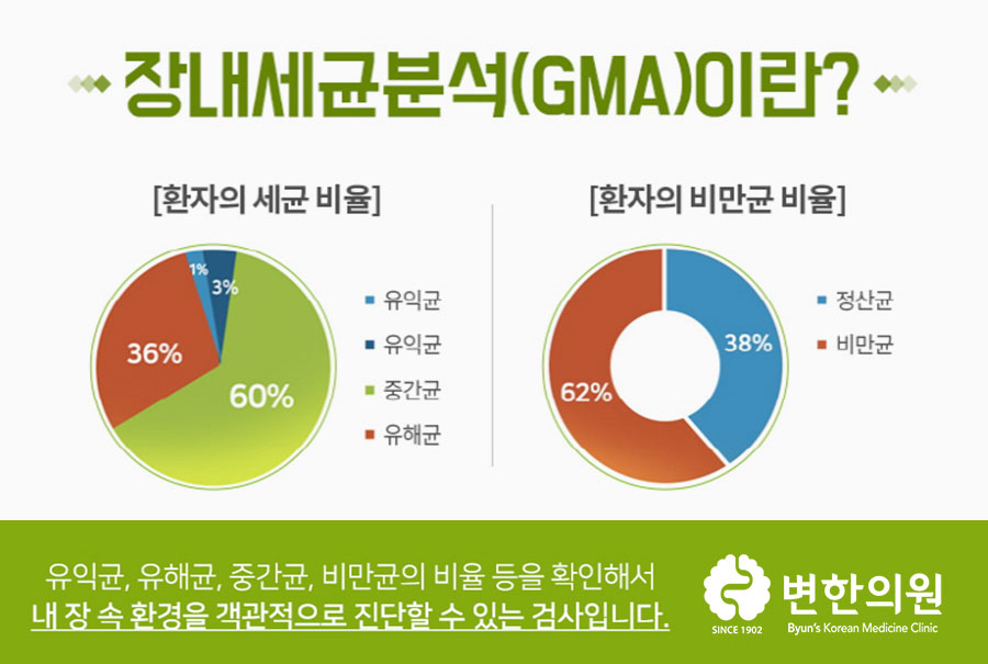 위와 같은 검사들은 변한의원에서 기본적으로 진행되는 검사들로 만성변비의 근본 원인을 찾는 것에는 무리가 없지만 조금 더 자세한 검사를 원할 경우에는 유익균, 유해균, 중간균, 비만균의 비율을 알 수 있는 장내세균 검사(GMA)를 통해 장 대사 활동에 문제가 없는지 파악해드립니다.