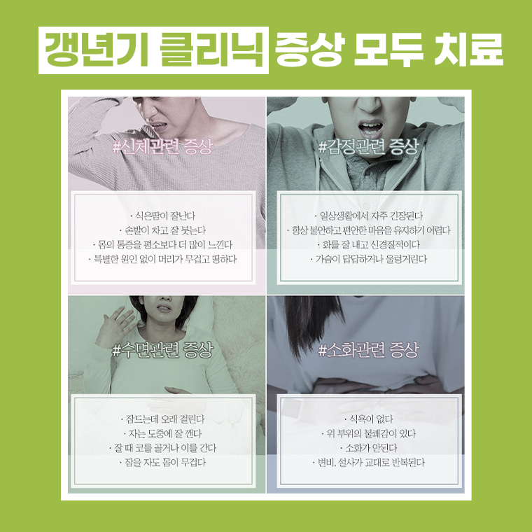 갱년기는 초기에 증상을 빠르게 바로잡는다면 경과가 빠르게 좋아지기 때문에 조금만 신경을 써주신다면 중년층의 고민들은 사라지게 되고 건강하게 지내실 수 있게 됩니다.